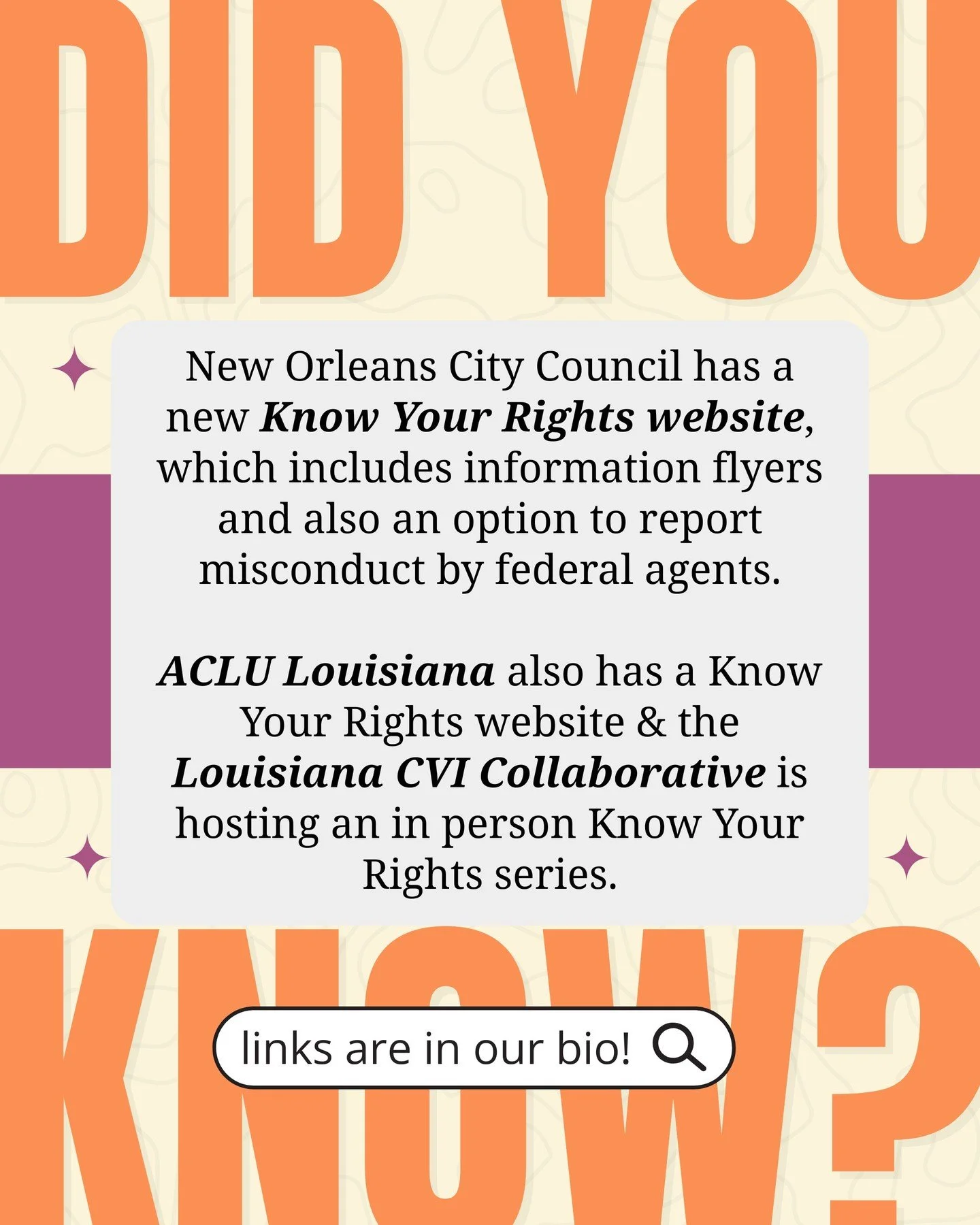 1 (866) 528-6748 • Register via LA VINE: https://vinelink.vineapps.com/state/LA • Crime Survivors NOLA Guide to VINELink: www.crimesurvivorsnola.org/la-vine • Monitors the custody status of adult inmates in all parish jails and state prisons (release from jail, transfer to another facility, etc.)